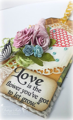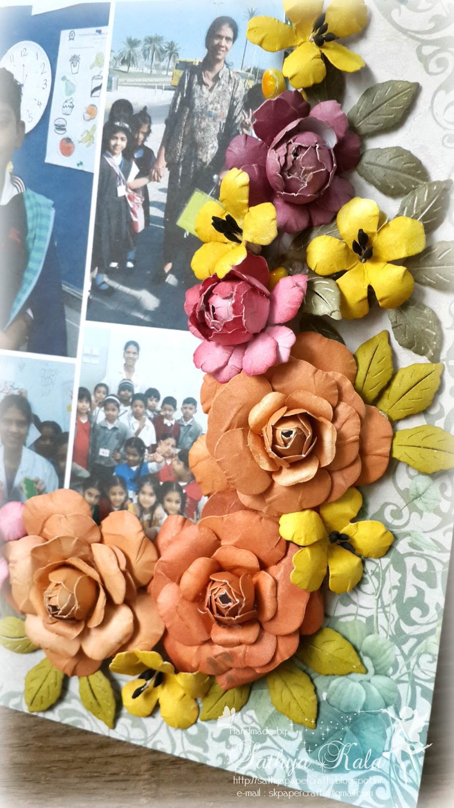 8x8 pp used for the floral layout. Floral spray is made completely handmade. Am missing these quite a while. I love to do handmade florals and atlast used this opportunity to do handmade blooms. Cheerylynn Tearose medium die used to make the small blooms. MFT petal party is used to make the yellow flowers. Joycraft dies are used for big roses. Flowers sponged,dry embossed, shaped to make Roses.