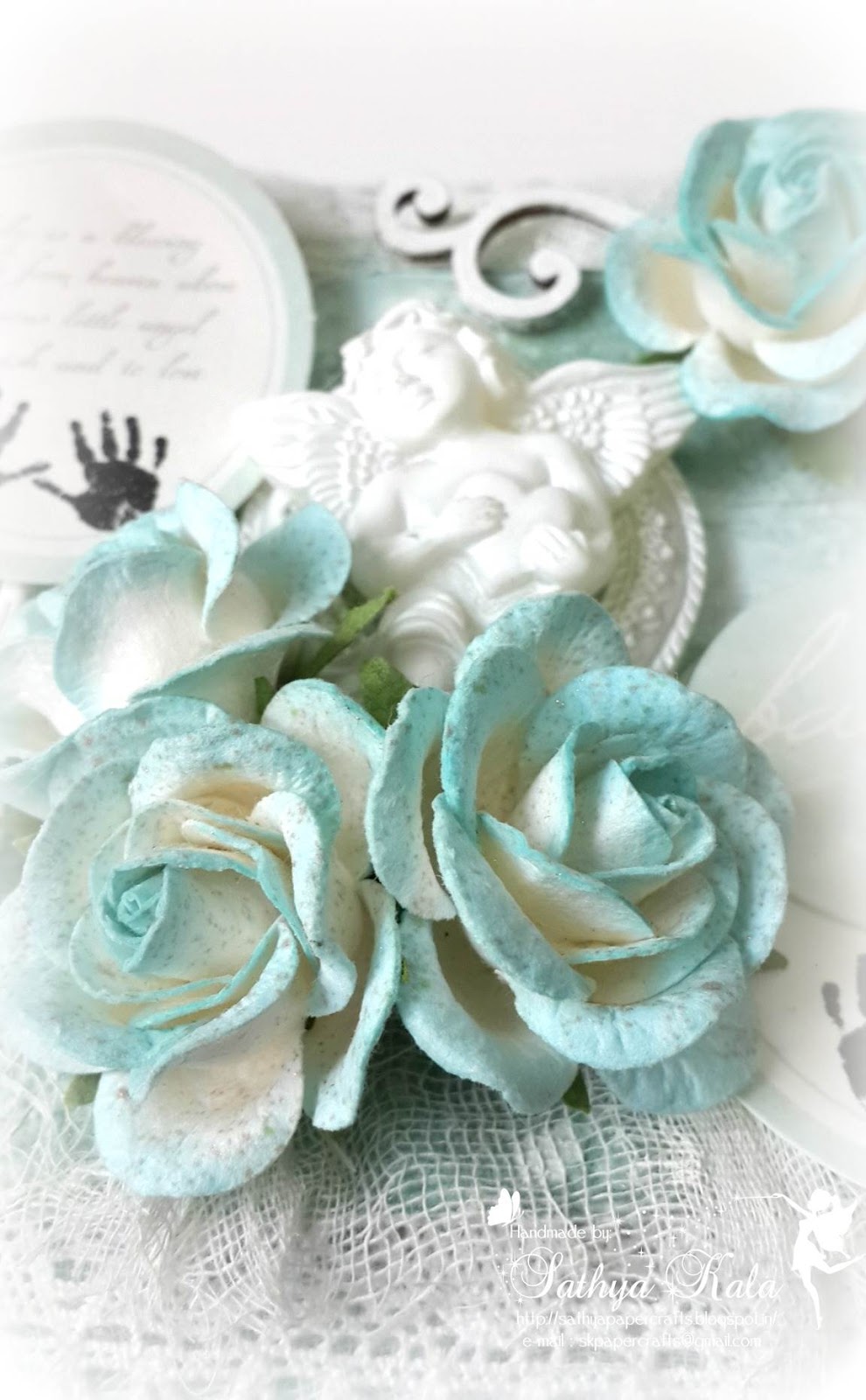 - Then came embellishment part with resins, mdf scrolls which are white heat embossed with Ranger Embossing powders, crochet laces, Kaisercraft Pittypatters diecuts, flowers misted with LSG azure sea asters, Prima Metal Zipper, Prima Junkyard words.
