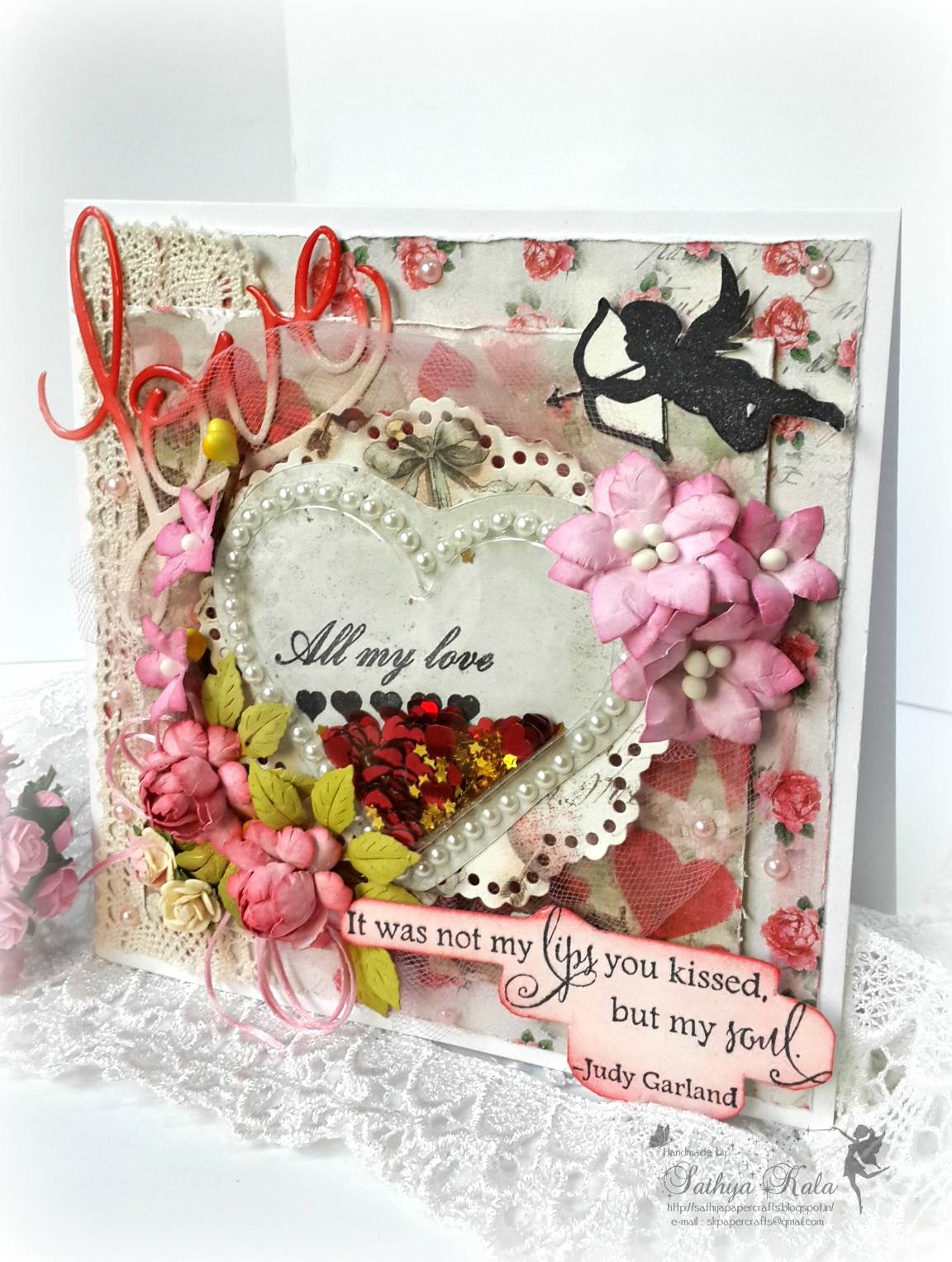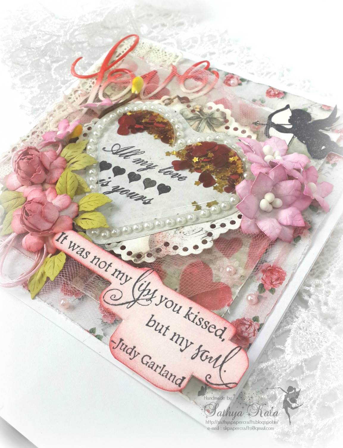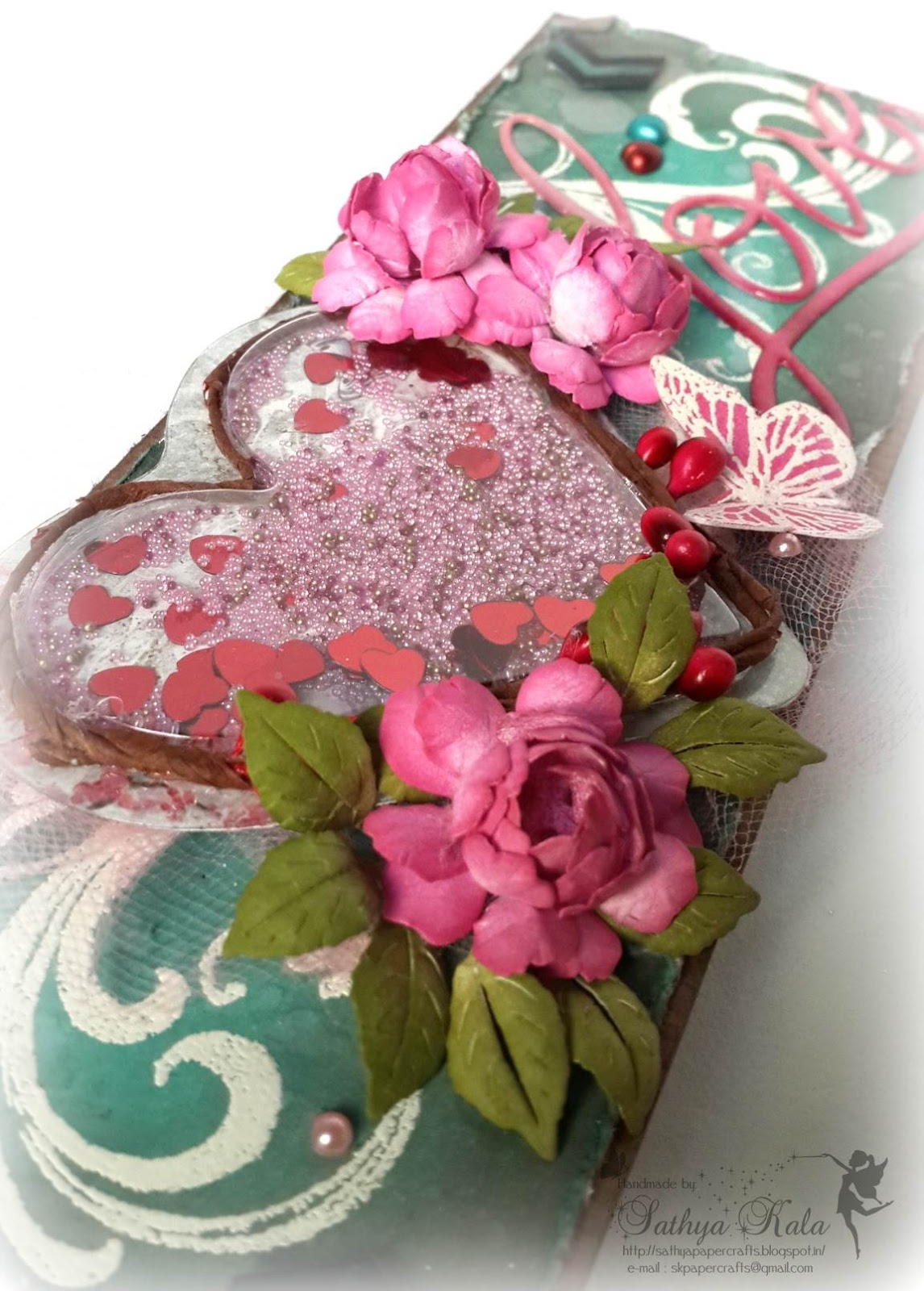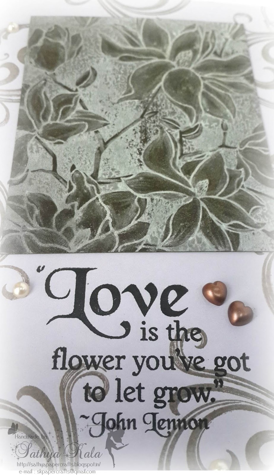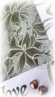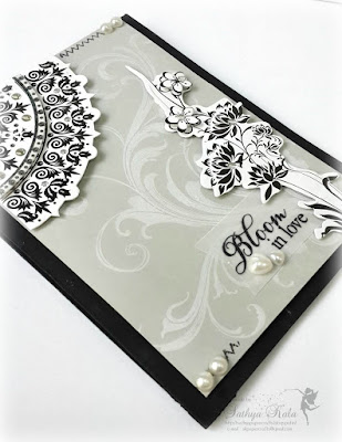 Quite a thought of what sentiment would be apt here. This IBS Sentiment would be apt for the season and for the floral sticker, fluorish in bg. Its stamped on a piece of vellum using Black archival ink and few heart pearls are added.
