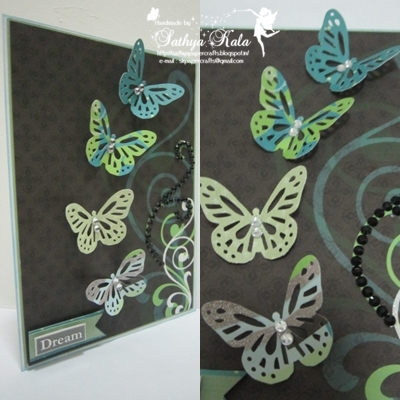 And matted it with a pale green cardstock, which then matted on a white cardstock, whose edges are distressed with Tumbled glass Distress ink. Added white rhinestones on butterflies and a black rhinestone flourish on base pp. Thought that the sentiment sticker Dream would perfectly match the card and so added it to a banner.