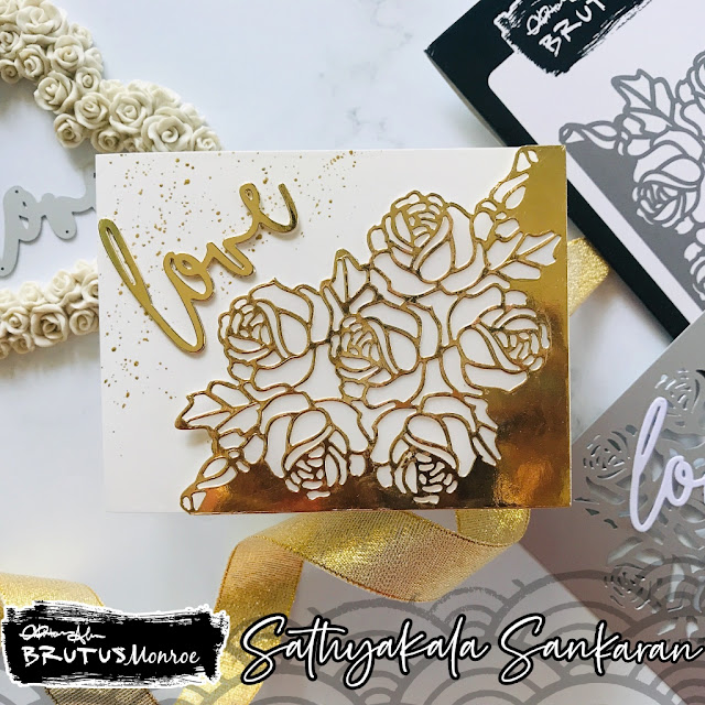 - I have die cut love scripty word die from Brutus Monroe With Love die set thrice in gold mirror cardstock and layered it up to give an extra dimension.